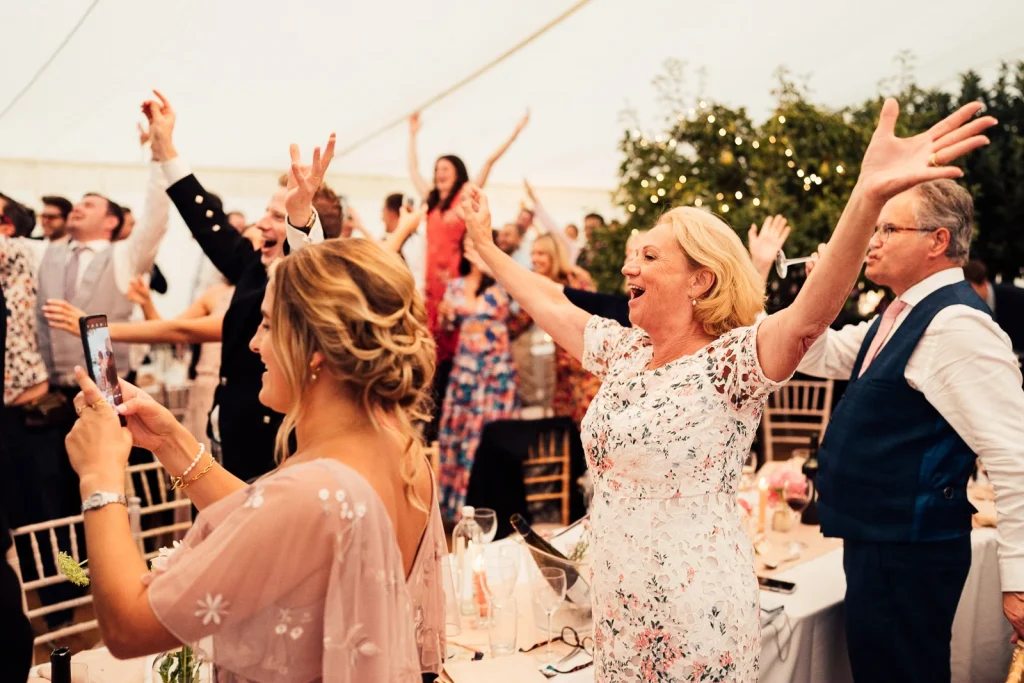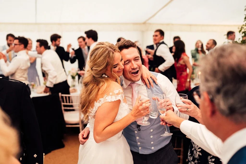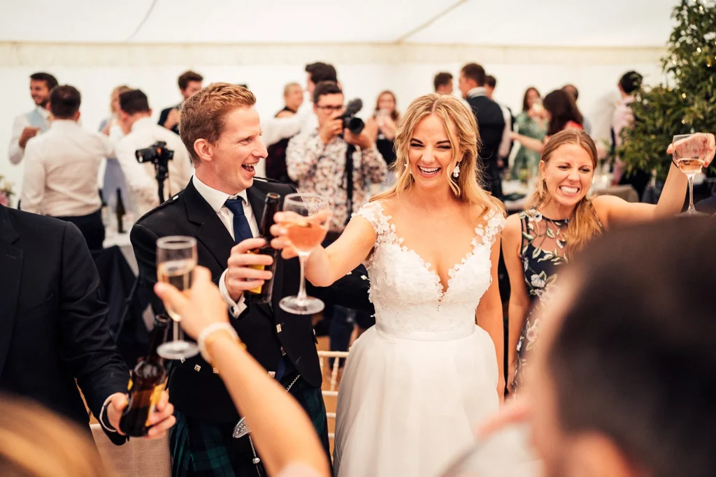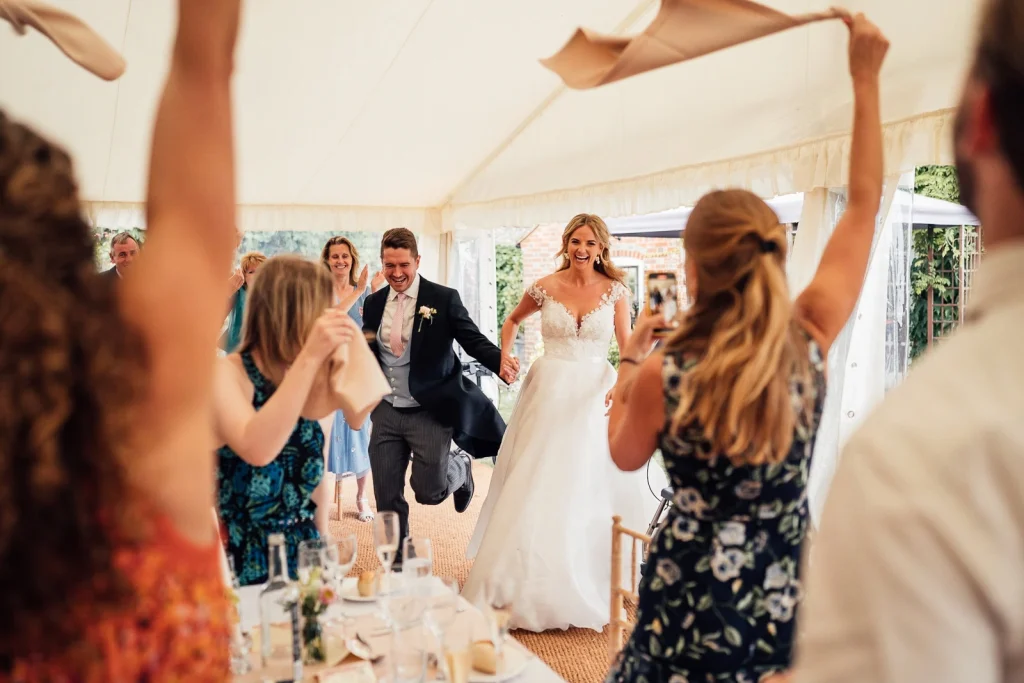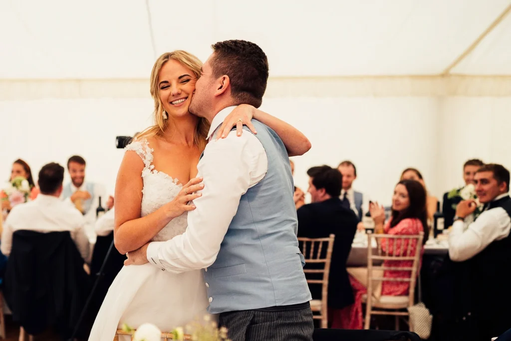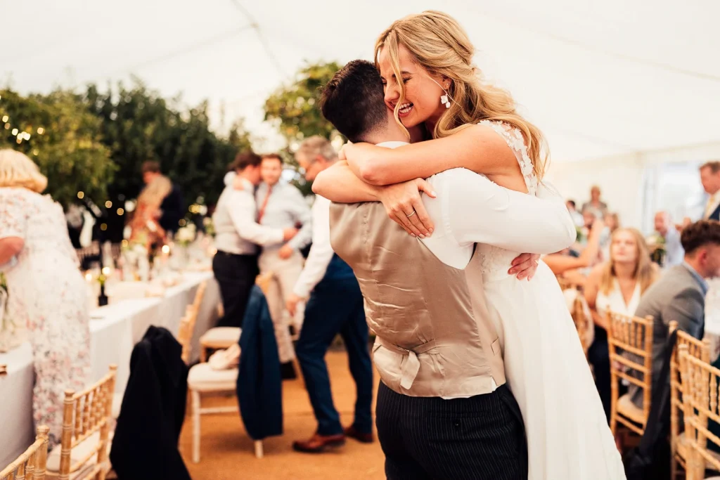 Back at White Pond Farm, guests gathered in a stunning marquee for the reception. The space was filled with personal touches, many crafted by Beana’s mum, including homegrown flowers and handmade decorations. It was a true reflection of the couple’s vision for a relaxed and personal celebration.