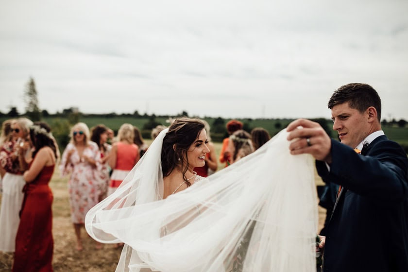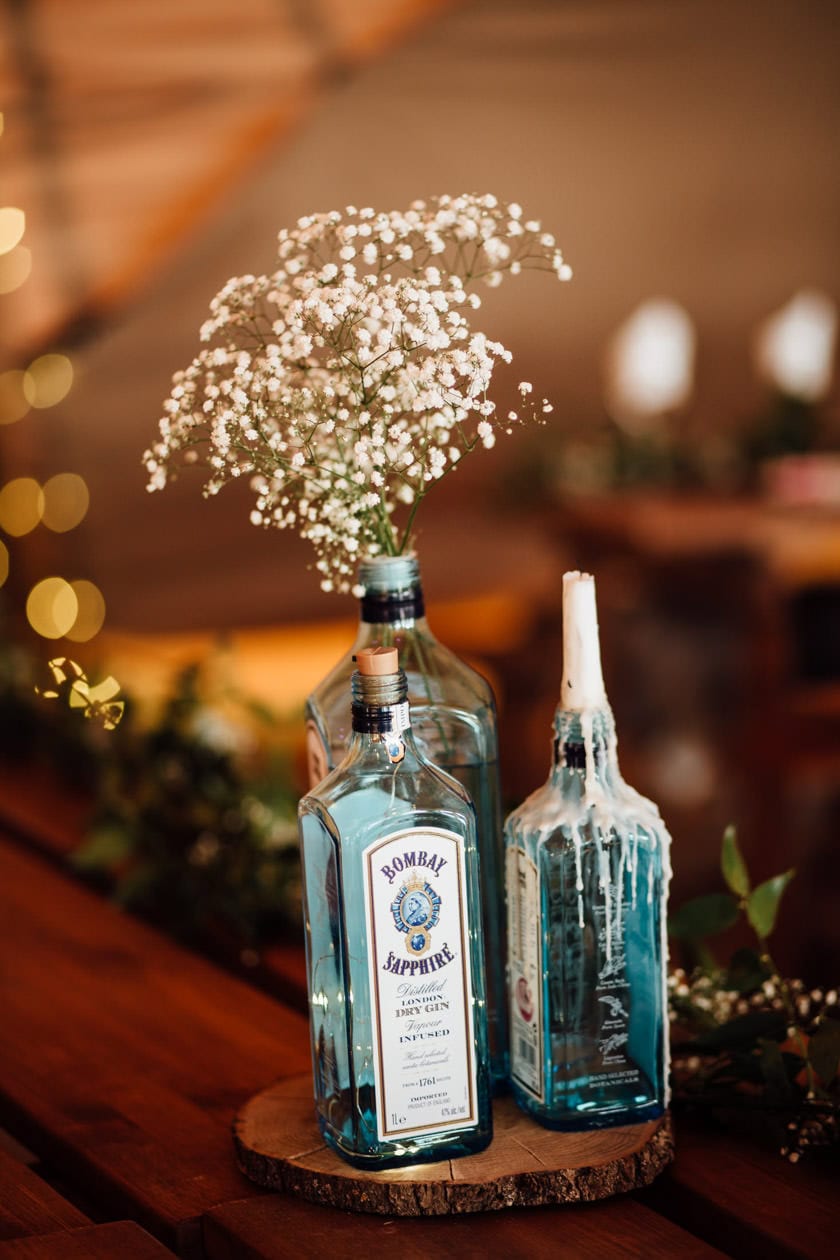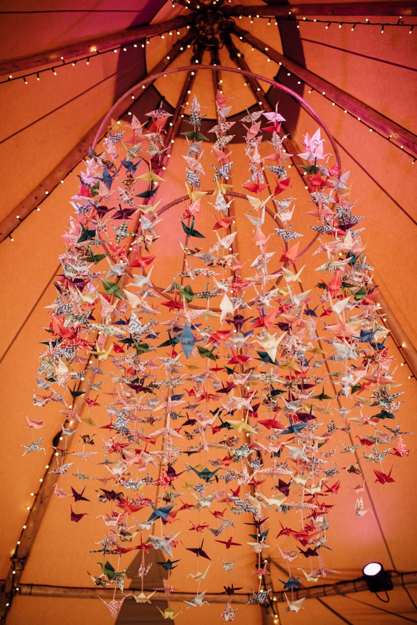 The reception was in a tipi at their friends farm. They chose the venue because it has so many options and they could totally personalise it. It was a festival kinda wedding, which was so relaxed as you know these are my fav kinda weddings. I love shooting outdoor weddings because they’re always so relaxed. The tables were decorated with gin bottles, candles & flowers – so simple yet so effective! The most impressive thing was the chandelier made out of hundreds of handmade (!!!) paper cranes! It definitely made those tipis look more unique :).