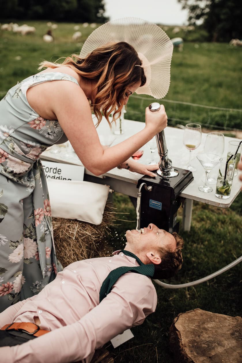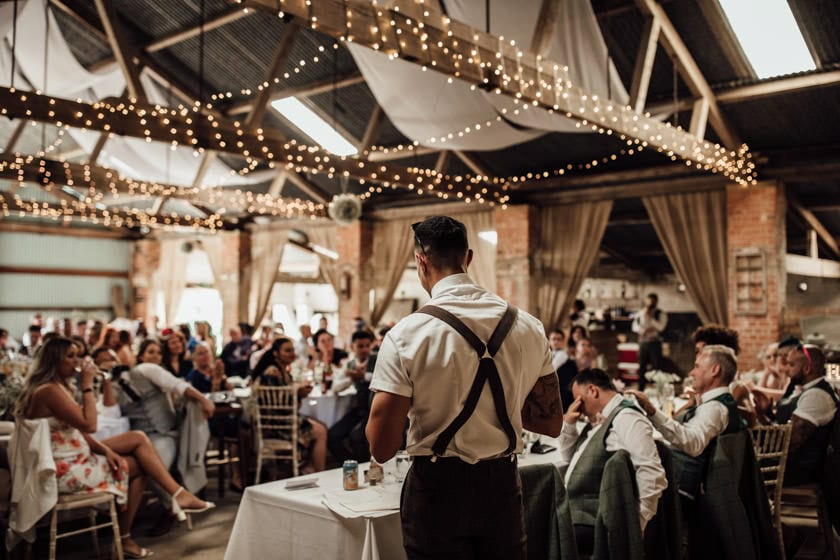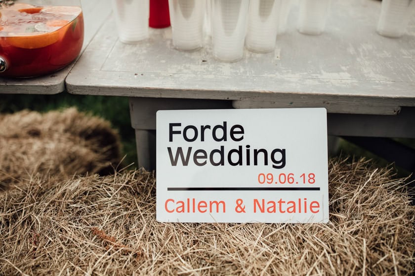 The couple decorated their venue with twinkly lights that went over the beams, jam jars with flowers & wooden table numbers which fitted in with the rustic theme of this wedding. They also had plenty of drinks set outside in the wheel barrel and on wooden crates! 🙂